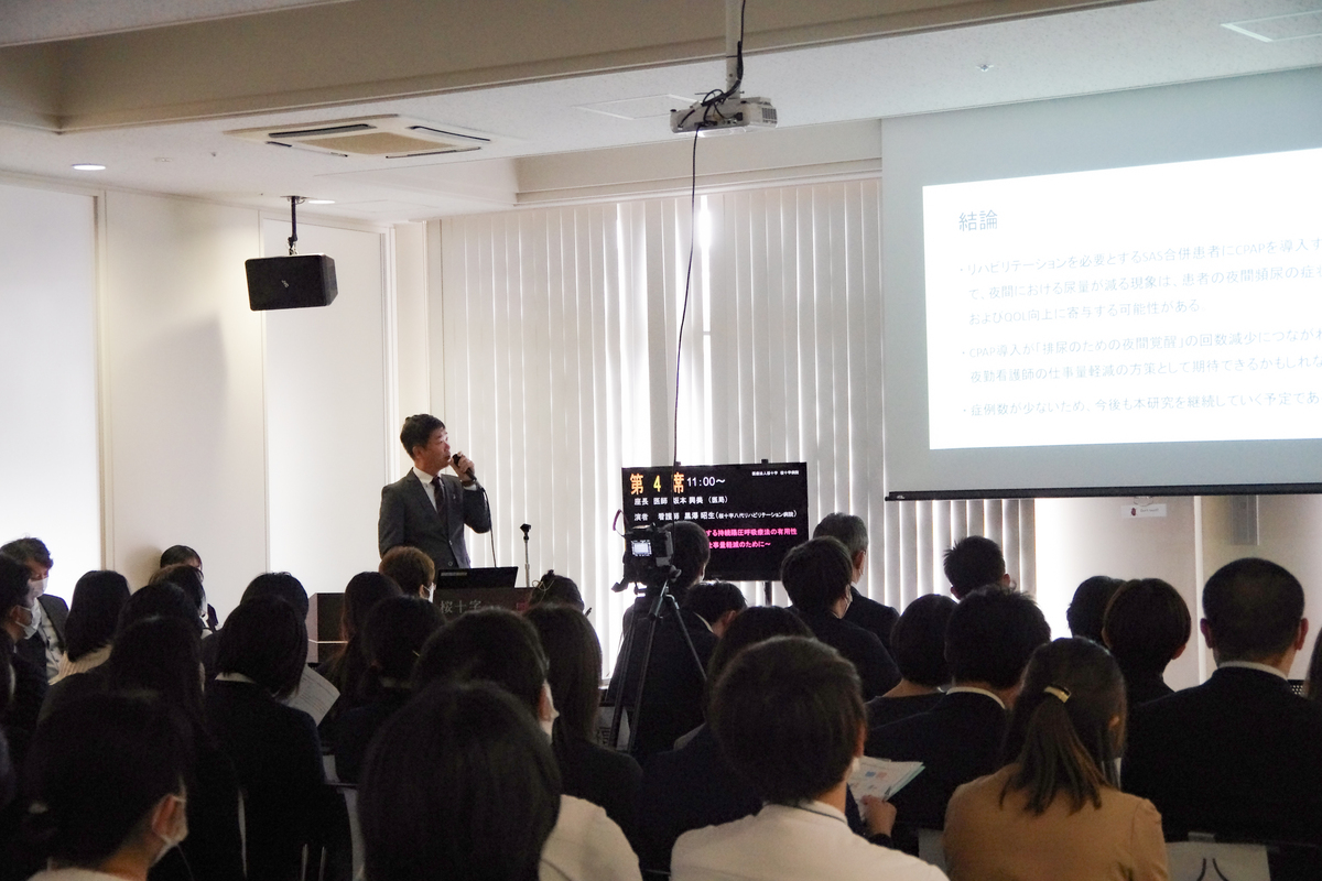 黒﨑信子さん(以下、黒﨑) 病院開設以来年に1例ずつ、各病棟で順番に看護研究を担当しています。これまでの研究内容は、「歯科衛生士と連携した口腔ケアの取り組み(2020年)」「転倒数軽減に向けての取り組み(2021年)」、「回復期病棟におけるフットケアの必要性(2022年」、「睡眠時無呼吸症候群に対する持続陽圧呼吸療法の有用性(2023年)」、「夜間頻尿に対する持続陽圧呼吸療法の有用性(2023年)」、「回復期リハビリテーション病棟における身体拘束最小化に向けた取り組み(2024年)」です。