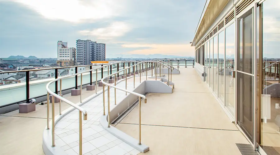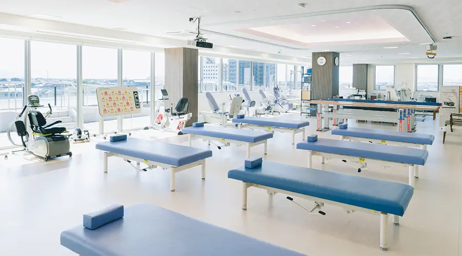総合リハビリテーション室は5階にあり、「フィジカルエリア」「ラボエリア」「キッチンエリア」の3つの機能的なエリアに分かれています。また、スカイラウンジ(リハビリ庭園)も併設しており、開放的で景観の良い空間の中、心身ともにリフレッシュしながらリハビリに取り組むことができます。さらにアーケードに隣接しているため、雨天時でも濡れることなく屋外歩行練習が可能な点も魅力です。各種リハビリテーション機器や検査・測定機器、物理療法機器等も豊富に揃えています。