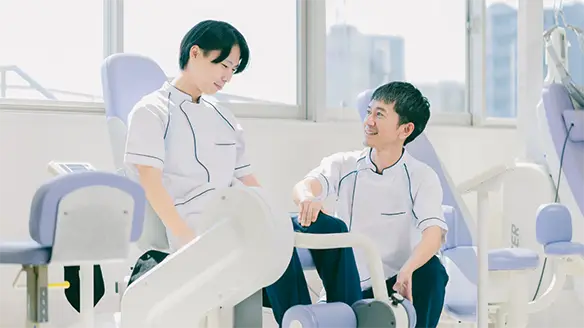 当リハビリテーション部は、100名を超えるスタッフが在籍する大規模な組織です。若手スタッフも多く、活気にあふれた明るい雰囲気が特徴です。先輩・後輩、職種や年齢を問わず、お互いに支え合い、「人を想う文化」を大切にした職場づくりに努めています。気軽に相談や意見交換ができる環境です。スポーツサークル活動も盛んで、職場以外でも交流を深めています。新人教育体制も整っており、「みんなで学び、みんなで成長する」風土を大切にしています。定期的な勉強会や症例検討会に加え、職種の垣根を越えた連携・チーム医療にも積極的に取り組んでいます。また、資格取得や学会発表への支援体制も整えており、各自の専門性を高めながら、広い視野を持って成長できる環境です。
