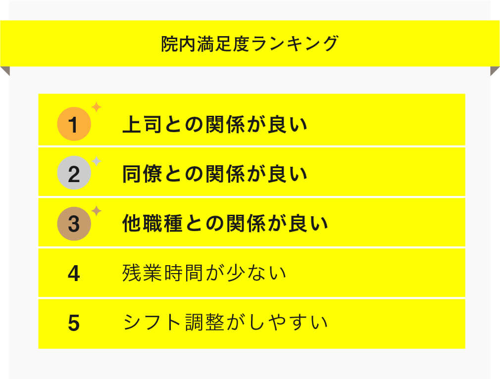 上司・同僚・他職種との関係性に関して、総じて満足度が高い結果となっており、人間関係の良さが際立ちます。また、残業時間の少なさやシフトの調整のしやすさという点も満足度が高く、仕事とプライベートの両立ができる働きやすい職場といえます。