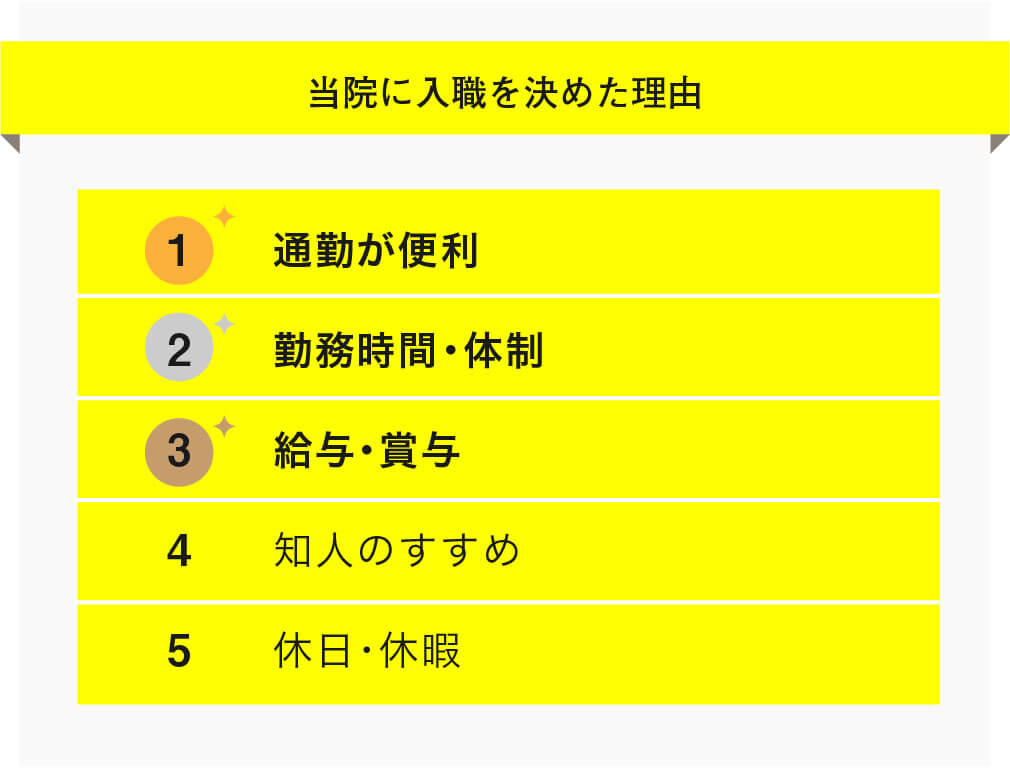 八代市在住の職員が多いため、通勤の便利さが最も多い結果となりました。勤務時間や給与や休日など、勤務する上で重要な勤務条件を見て、入職を決めた職員も多くいらっしゃいます。また、知人のすすめで入職を決めた職員も多く、地域からの信頼の厚さが感じられます。